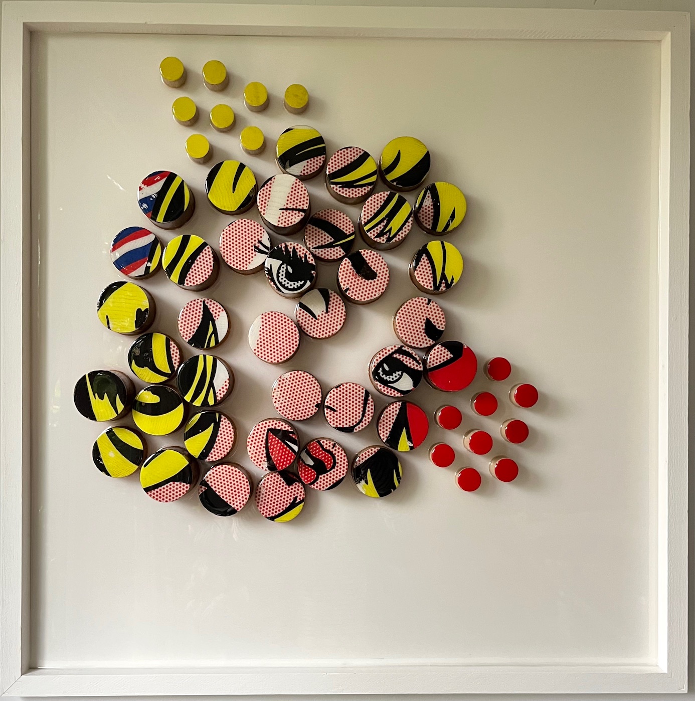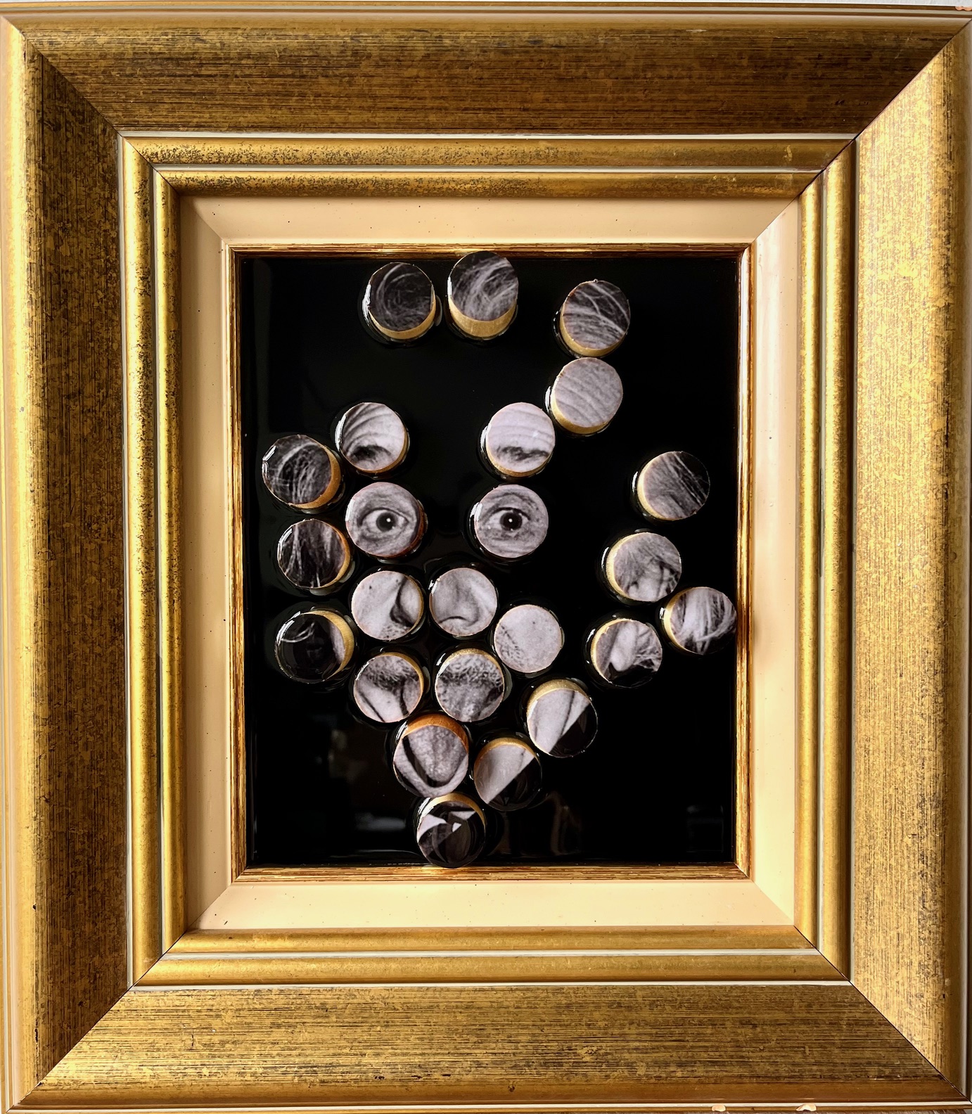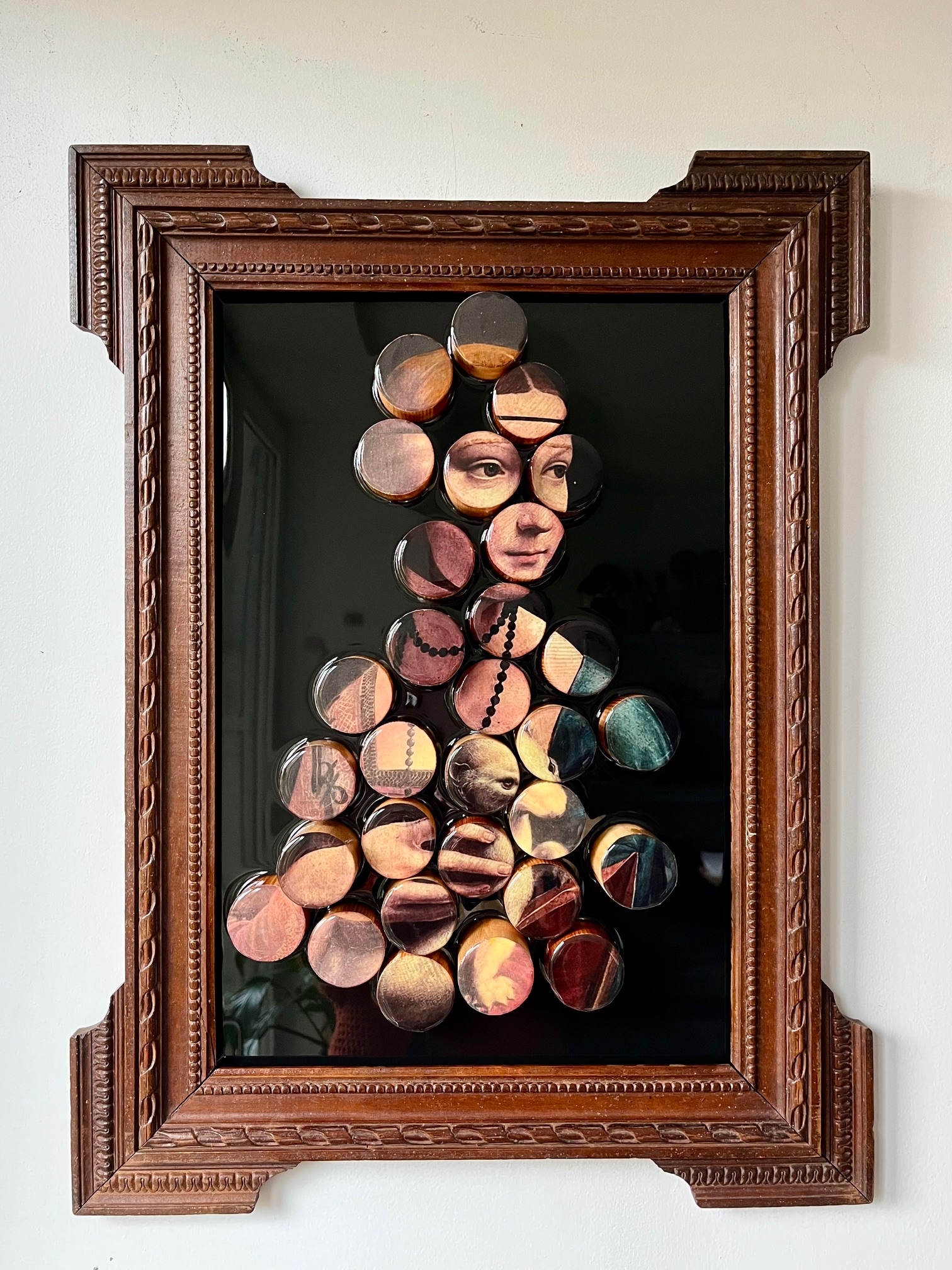 La série Cubes joue avec des compositions photographiques mêlant photos personnelles et oeuvres classiques ou modernes. Ces compositions sont transférées manuellement sur des cubes de bois de différentes hauteurs, ce qui crée de face un effet de pixelisation et de profil un effet de volume. Une résine époxy recouvre chaque pièce de bois. Les nouvelles oeuvres ne sont plus sur des cubes mais sont sur des ronds de bois, et montées sur cadres anciens |