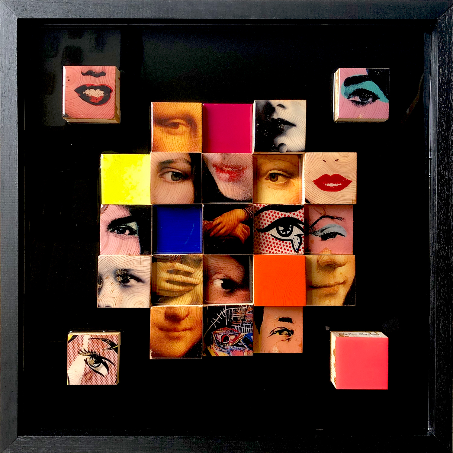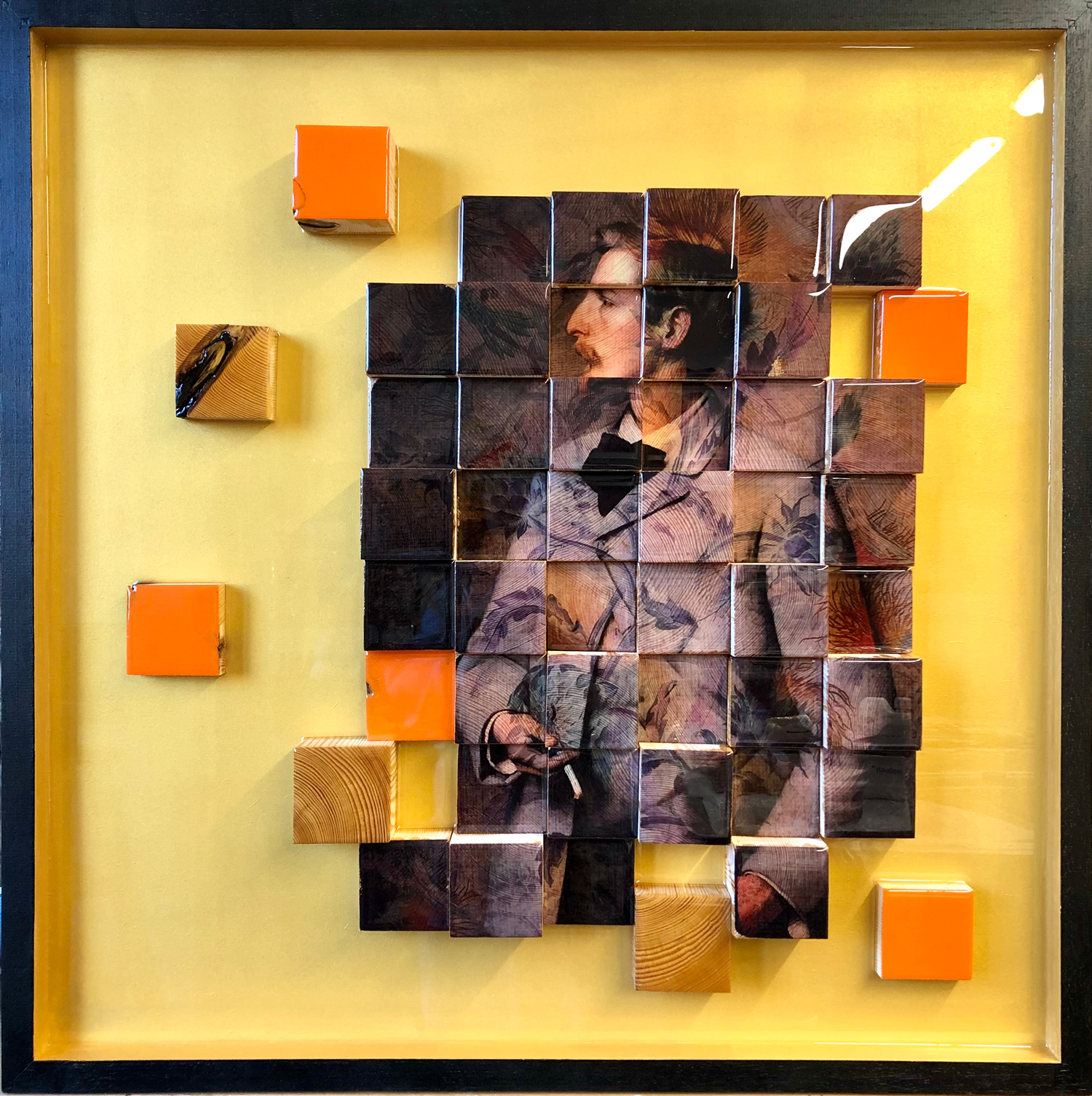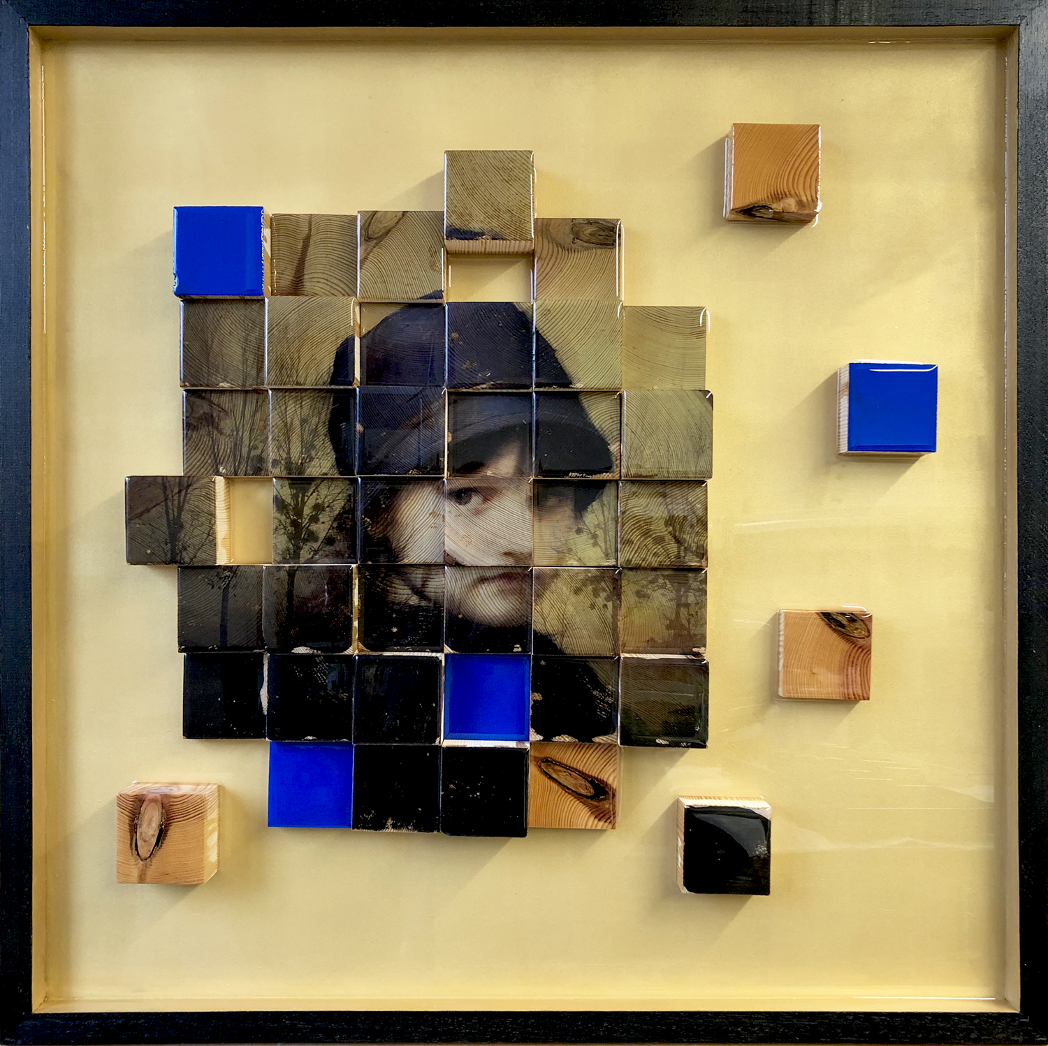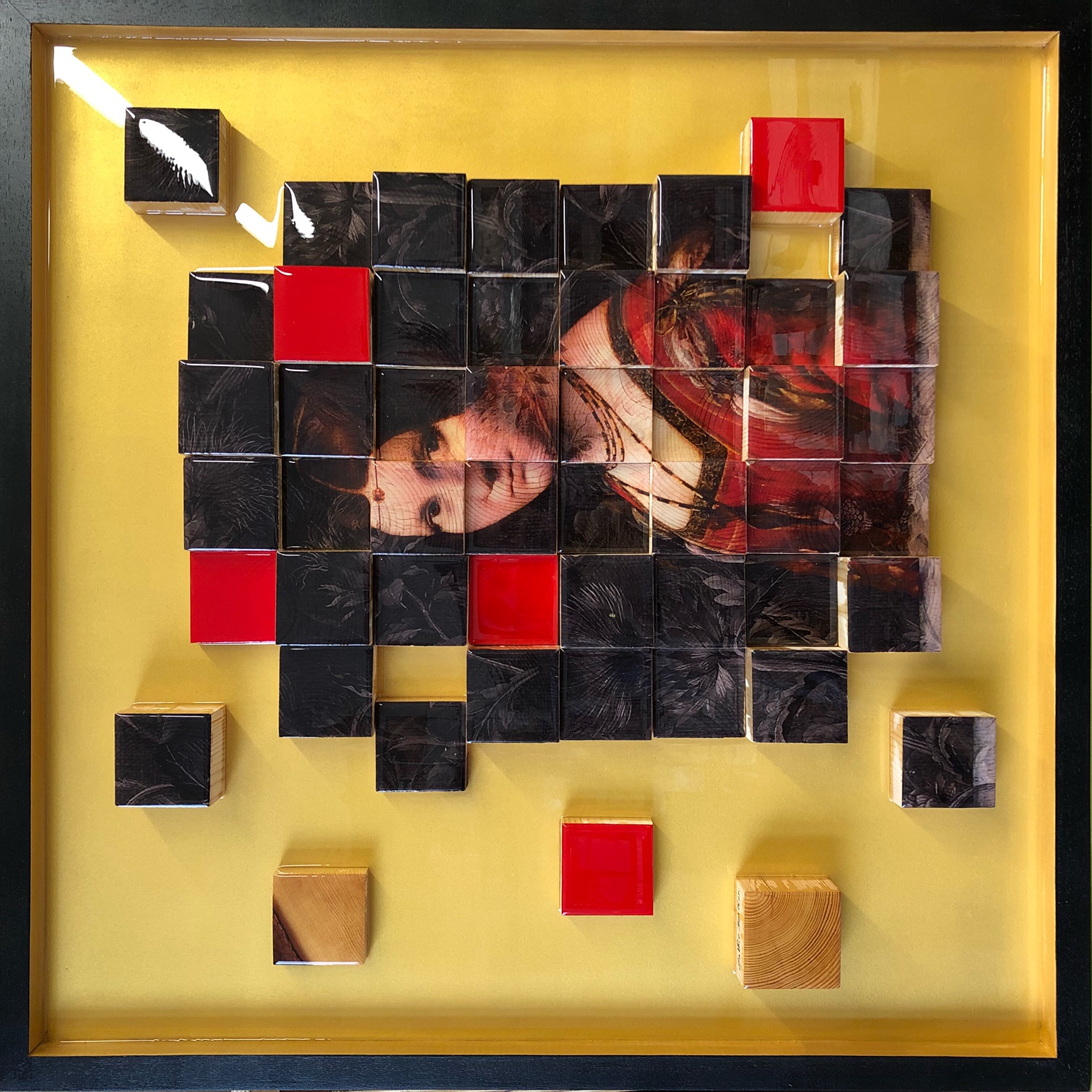 La série Cubes joue avec des compositions photographiques mêlant photos personnelles et oeuvres classiques ou modernes. Ces compositions sont transférées manuellement sur des cubes de bois de différentes hauteurs, ce qui crée de face un effet de pixelisation et de profil un effet de volume. Une résine époxy recouvre chaque pièce de bois. Les nouvelles oeuvres ne sont plus sur des cubes mais sont sur des ronds de bois, et montées sur cadres anciens |