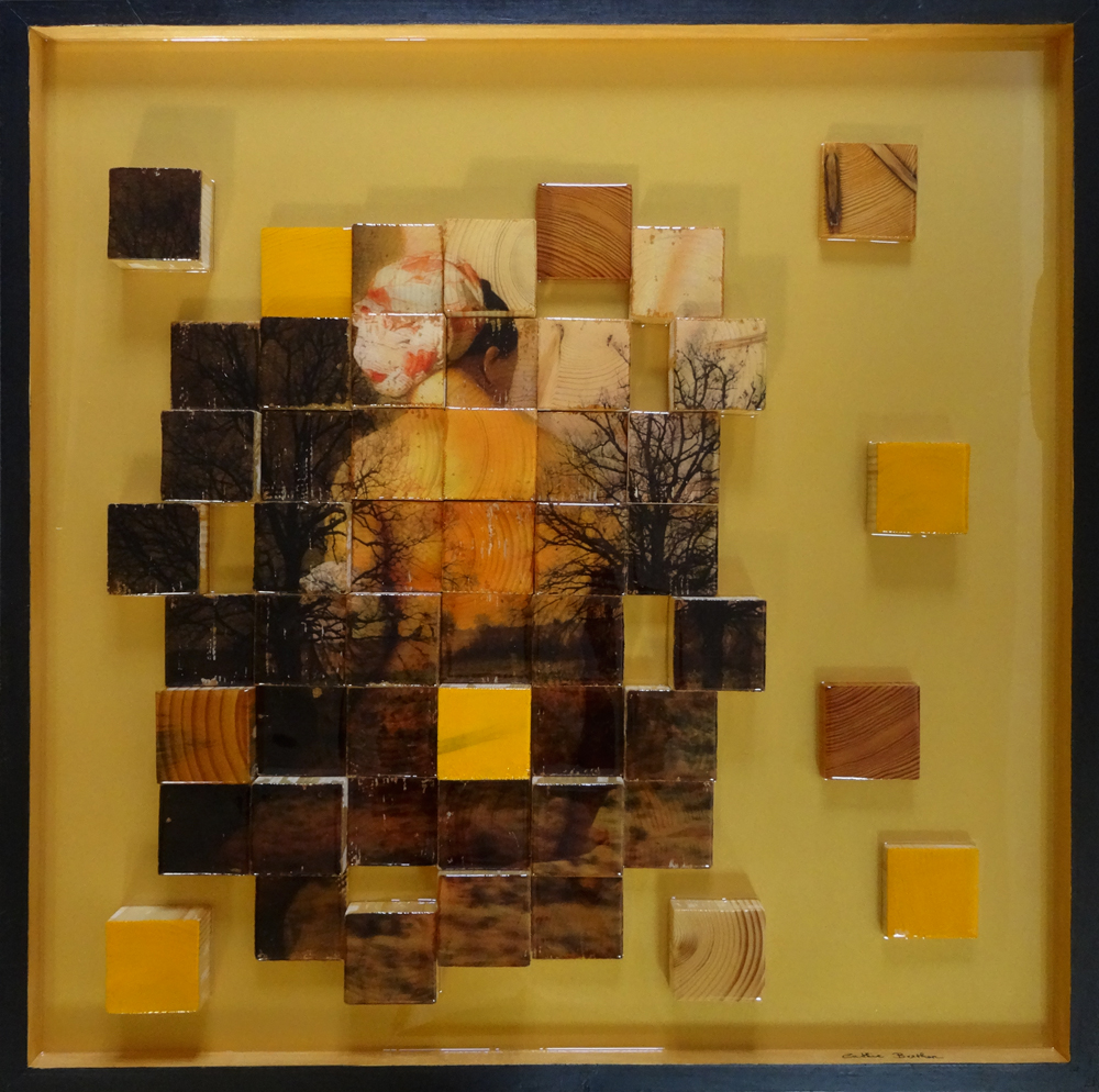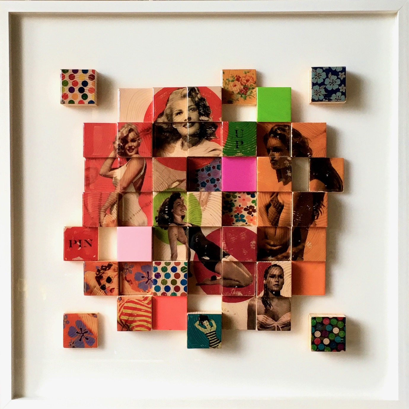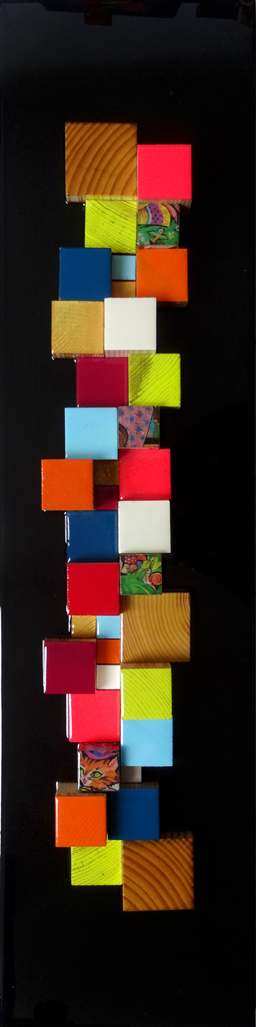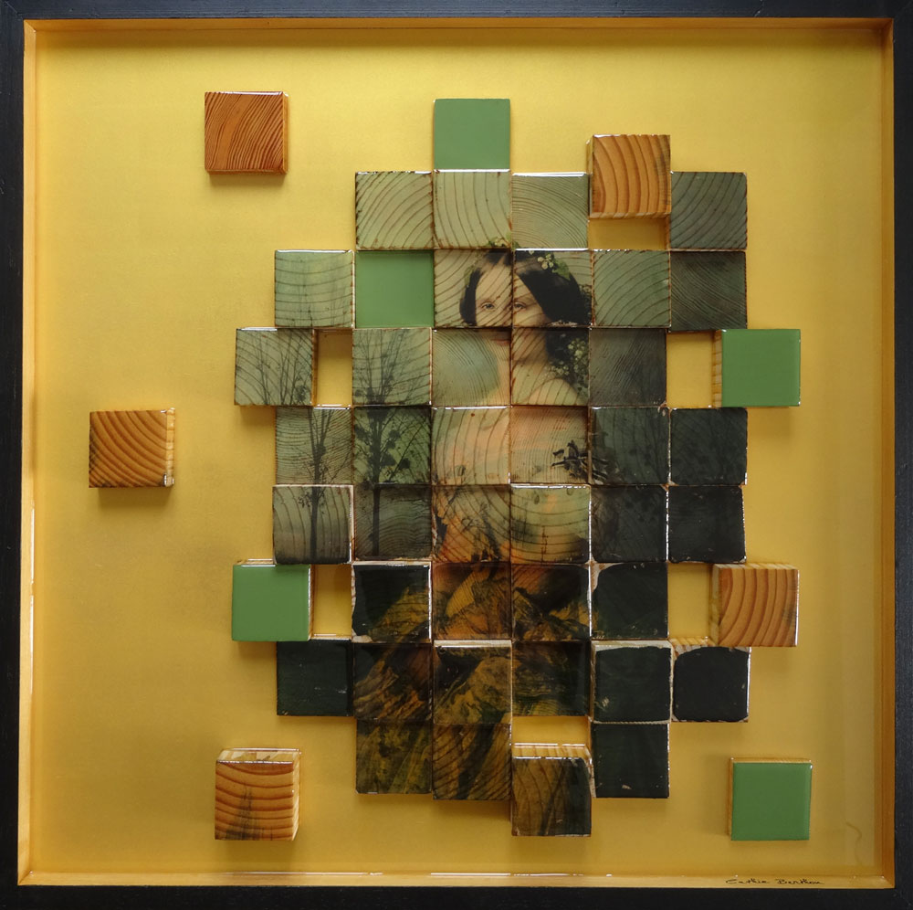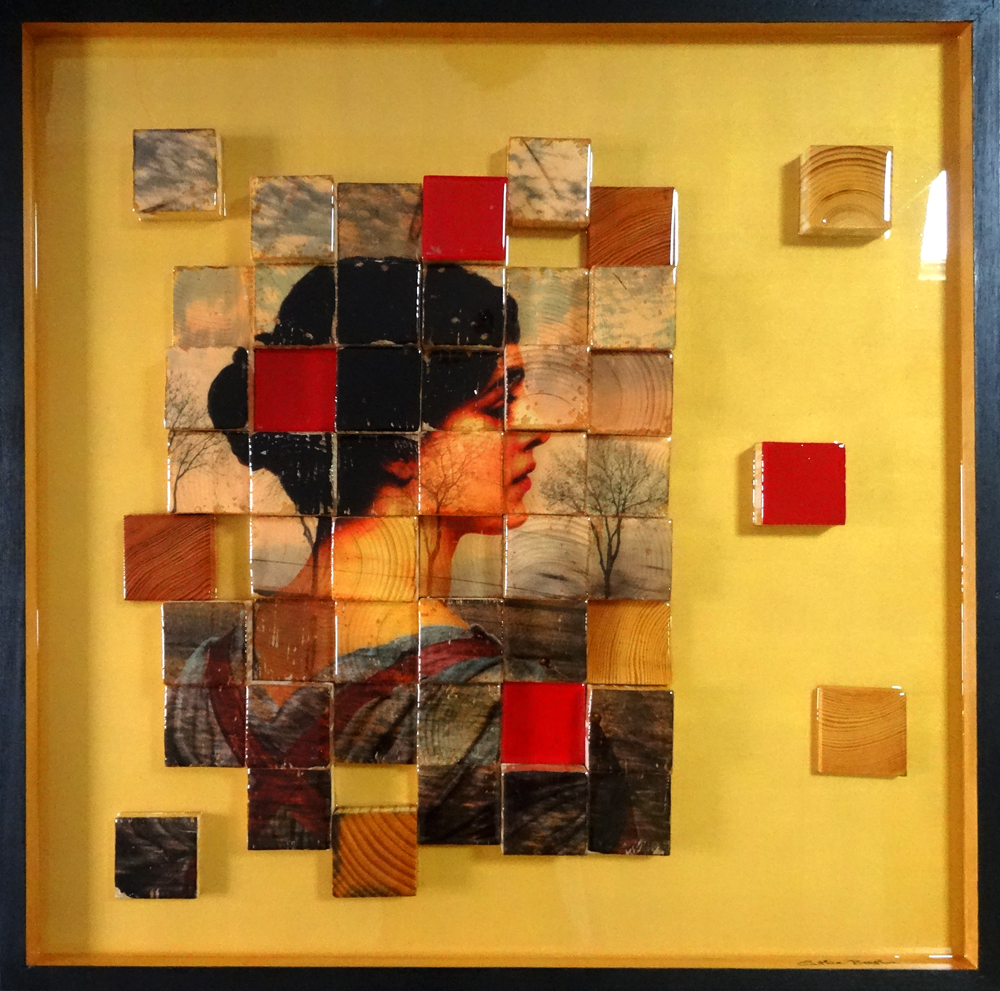 La série Cubes joue avec des compositions photographiques mêlant photos personnelles et oeuvres classiques ou modernes. Ces compositions sont transférées manuellement sur des cubes de bois de différentes hauteurs, ce qui crée de face un effet de pixelisation et de profil un effet de volume. Une résine époxy recouvre chaque pièce de bois. Les nouvelles oeuvres ne sont plus sur des cubes mais sont sur des ronds de bois, et montées sur cadres anciens |