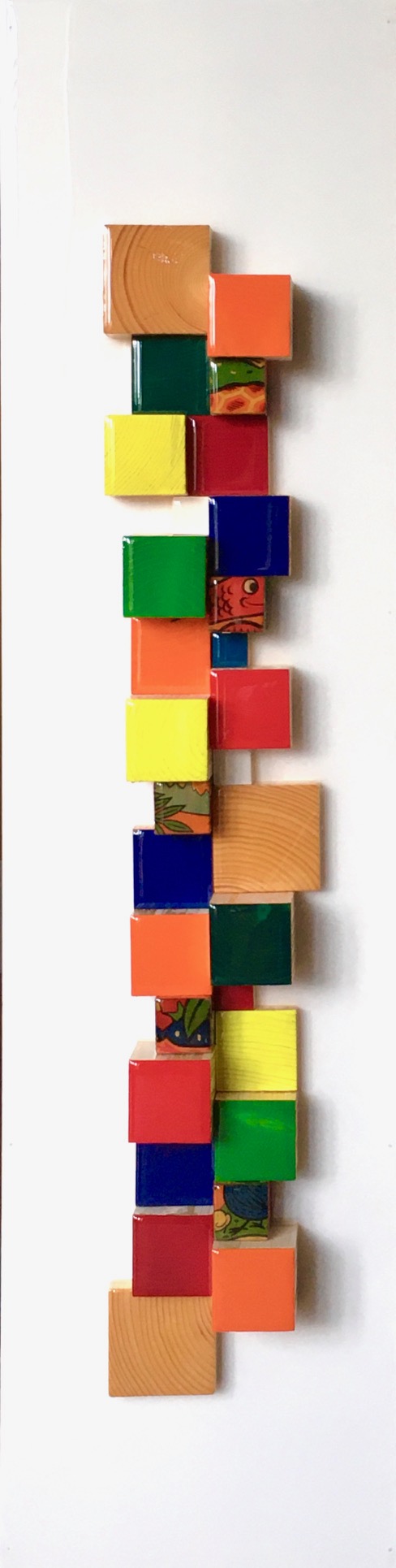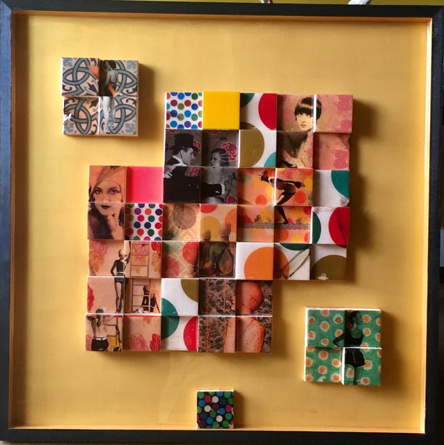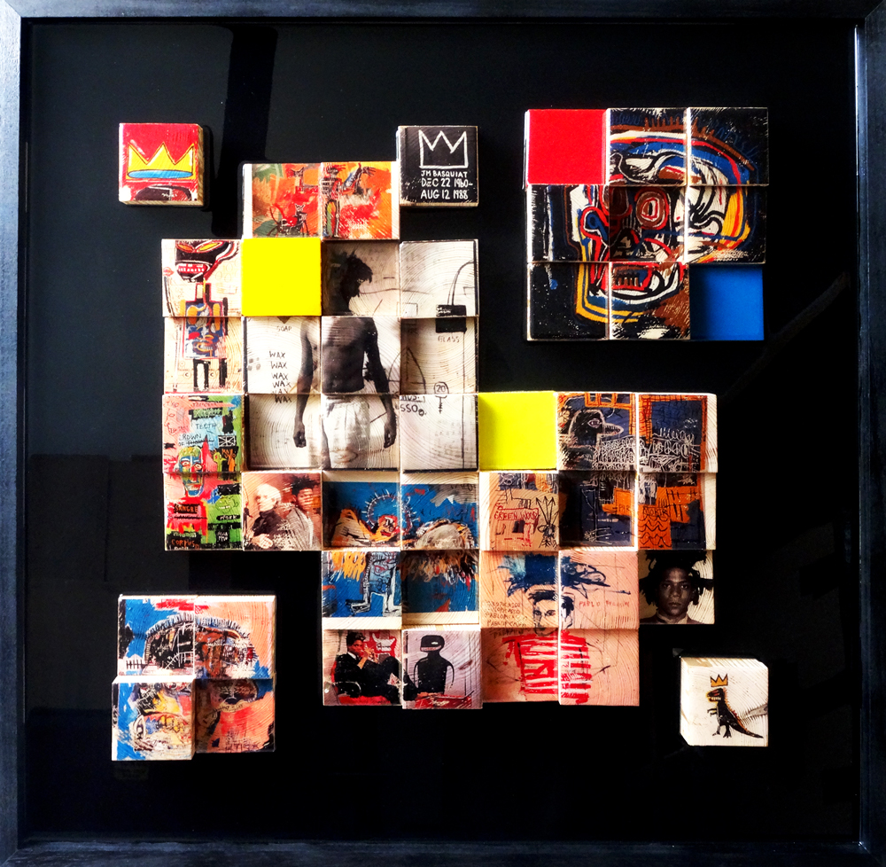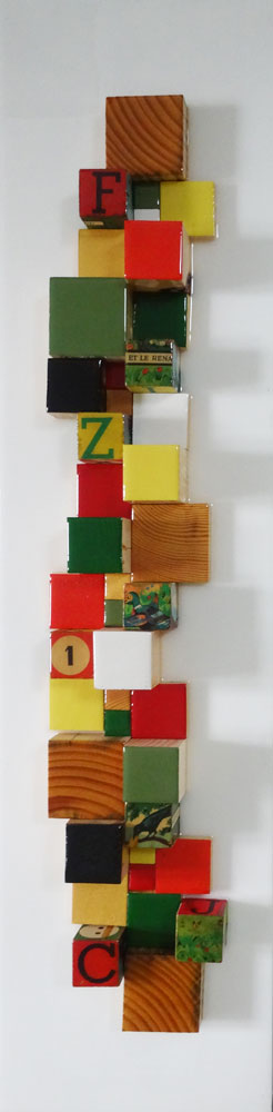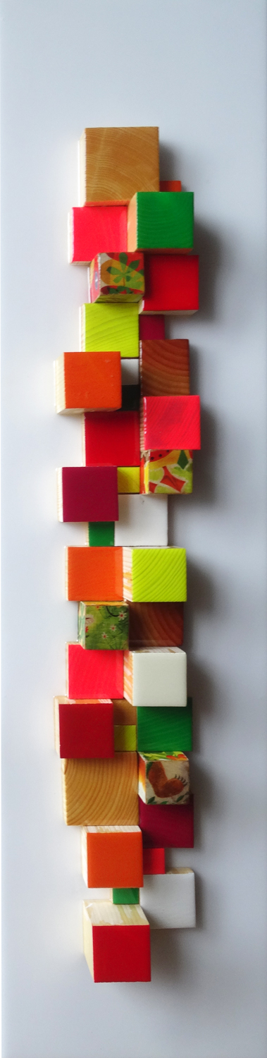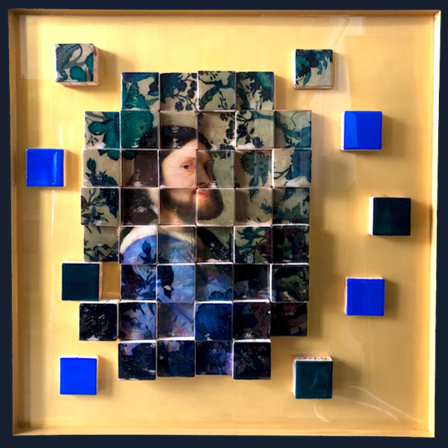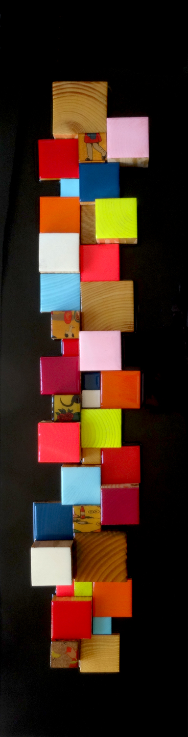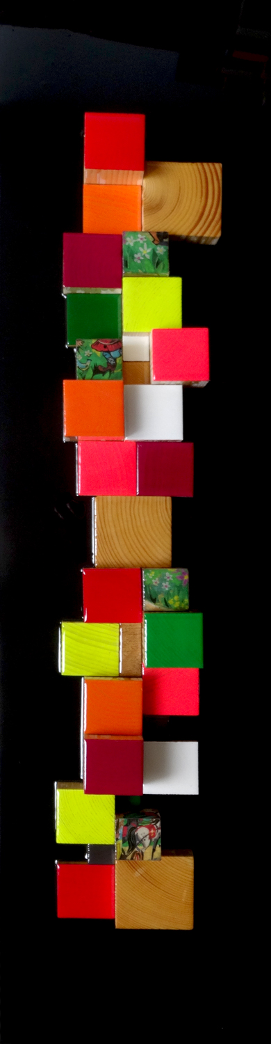 La série Cubes joue avec des compositions photographiques mêlant photos personnelles et oeuvres classiques ou modernes. Ces compositions sont transférées manuellement sur des cubes de bois de différentes hauteurs, ce qui crée de face un effet de pixelisation et de profil un effet de volume. Une résine époxy recouvre chaque pièce de bois. Les nouvelles oeuvres ne sont plus sur des cubes mais sont sur des ronds de bois, et montées sur cadres anciens |