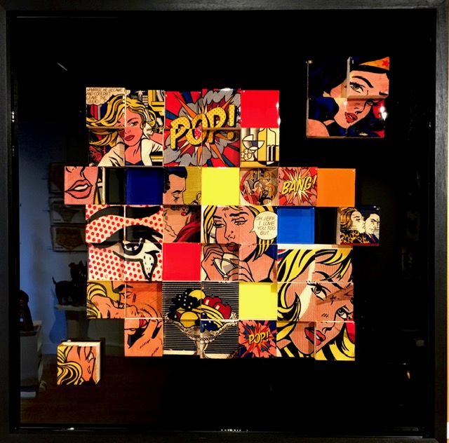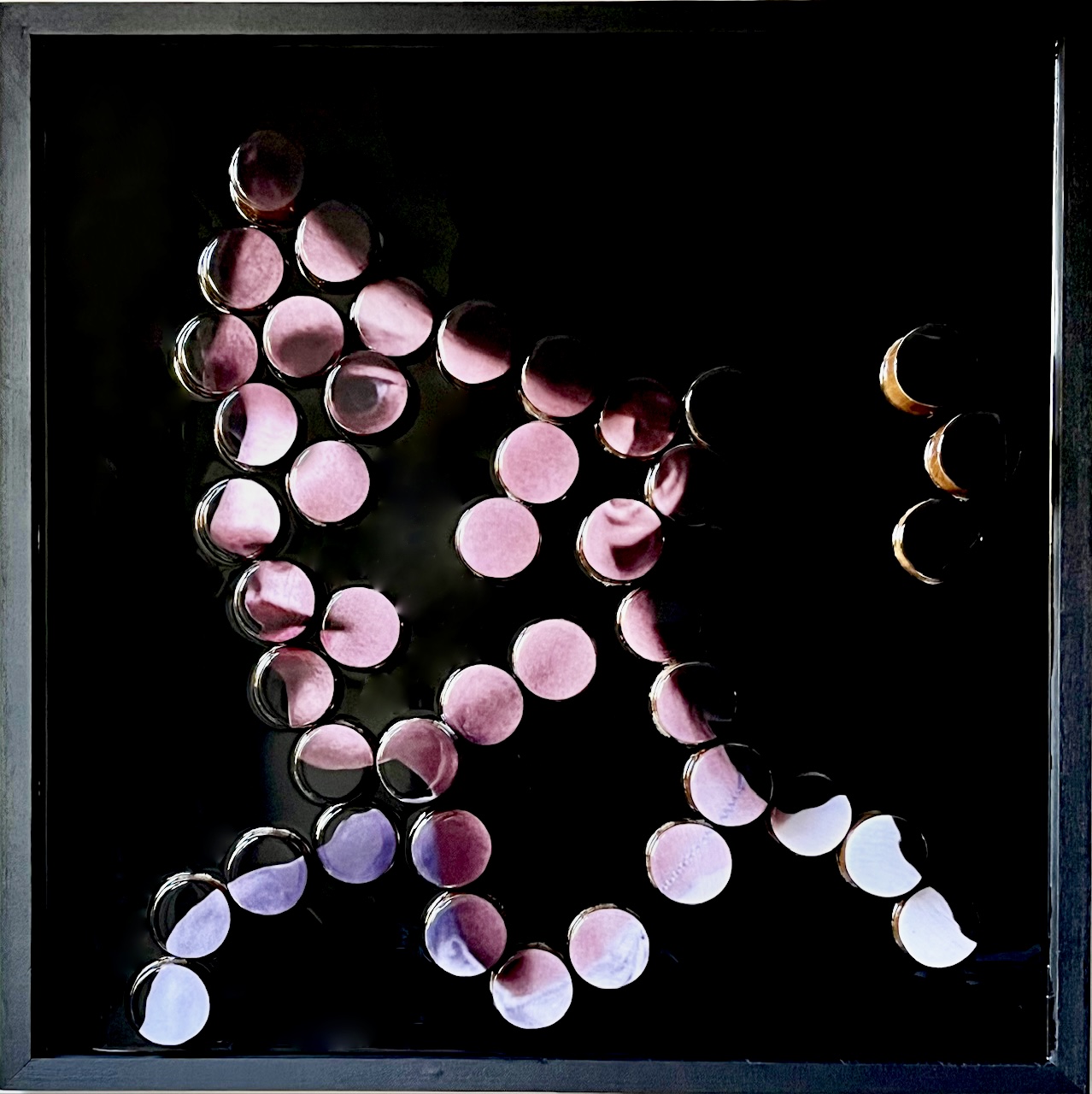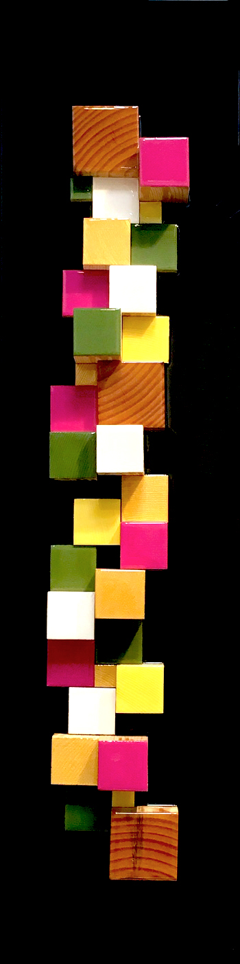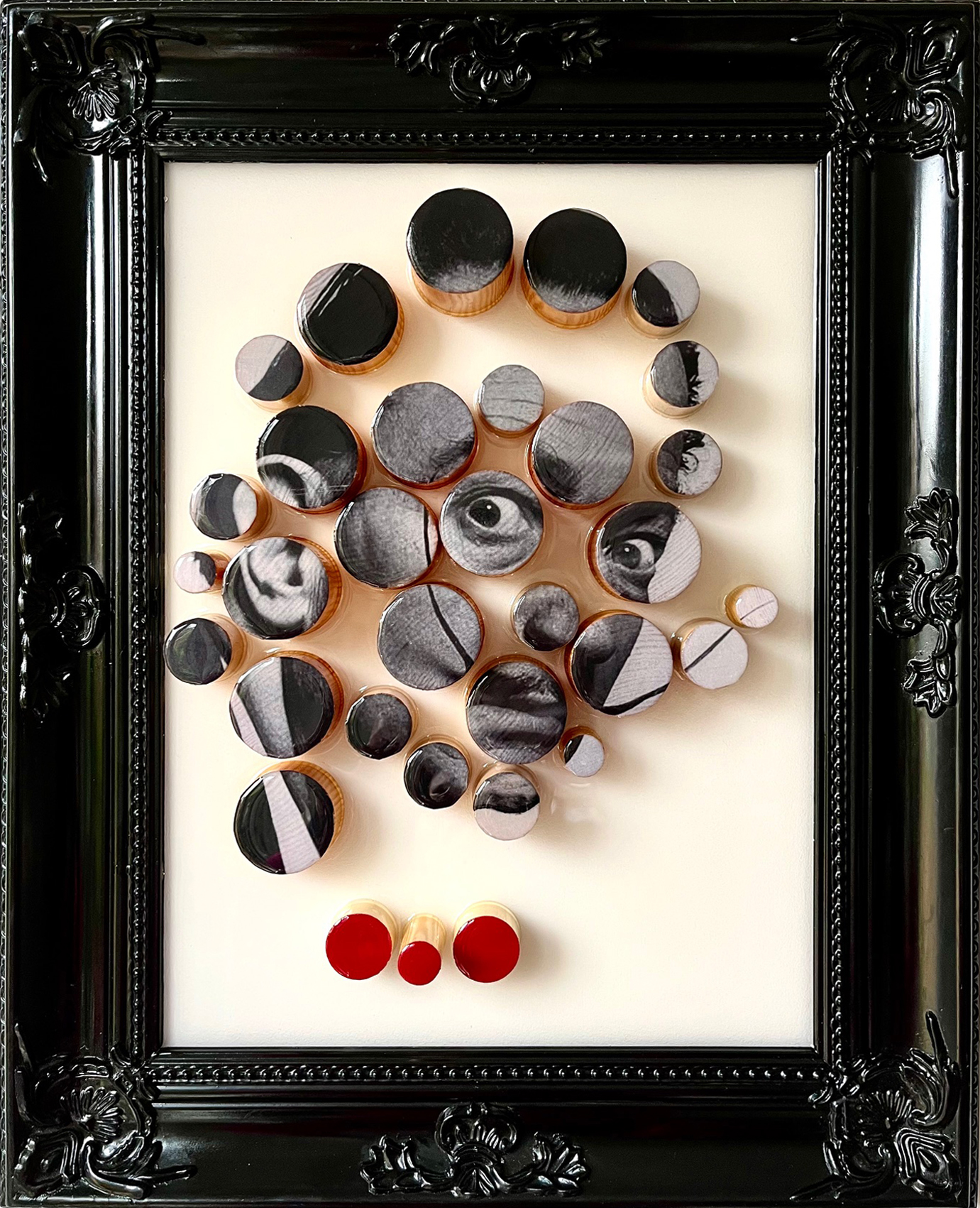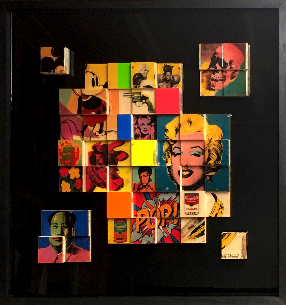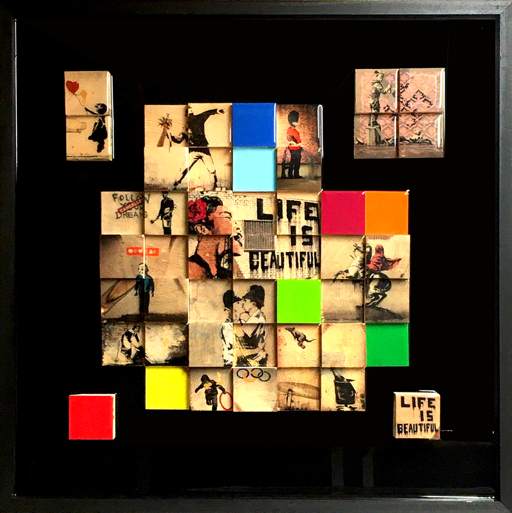 La série Cubes joue avec des compositions photographiques mêlant photos personnelles et oeuvres classiques ou modernes. Ces compositions sont transférées manuellement sur des cubes de bois de différentes hauteurs, ce qui crée de face un effet de pixelisation et de profil un effet de volume. Une résine époxy recouvre chaque pièce de bois. Les nouvelles oeuvres ne sont plus sur des cubes mais sont sur des ronds de bois, et montées sur cadres anciens |