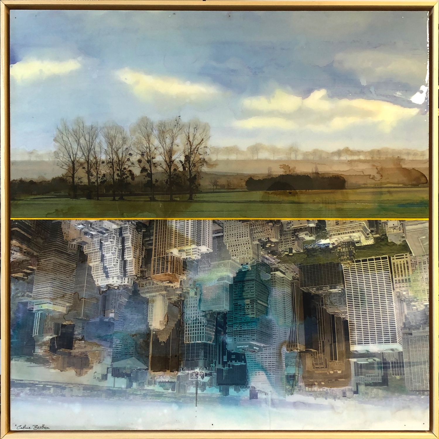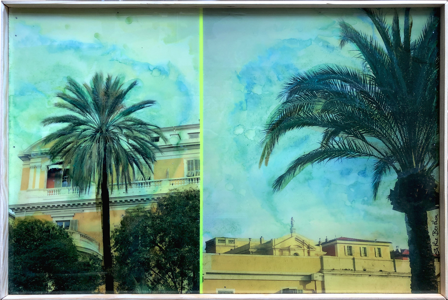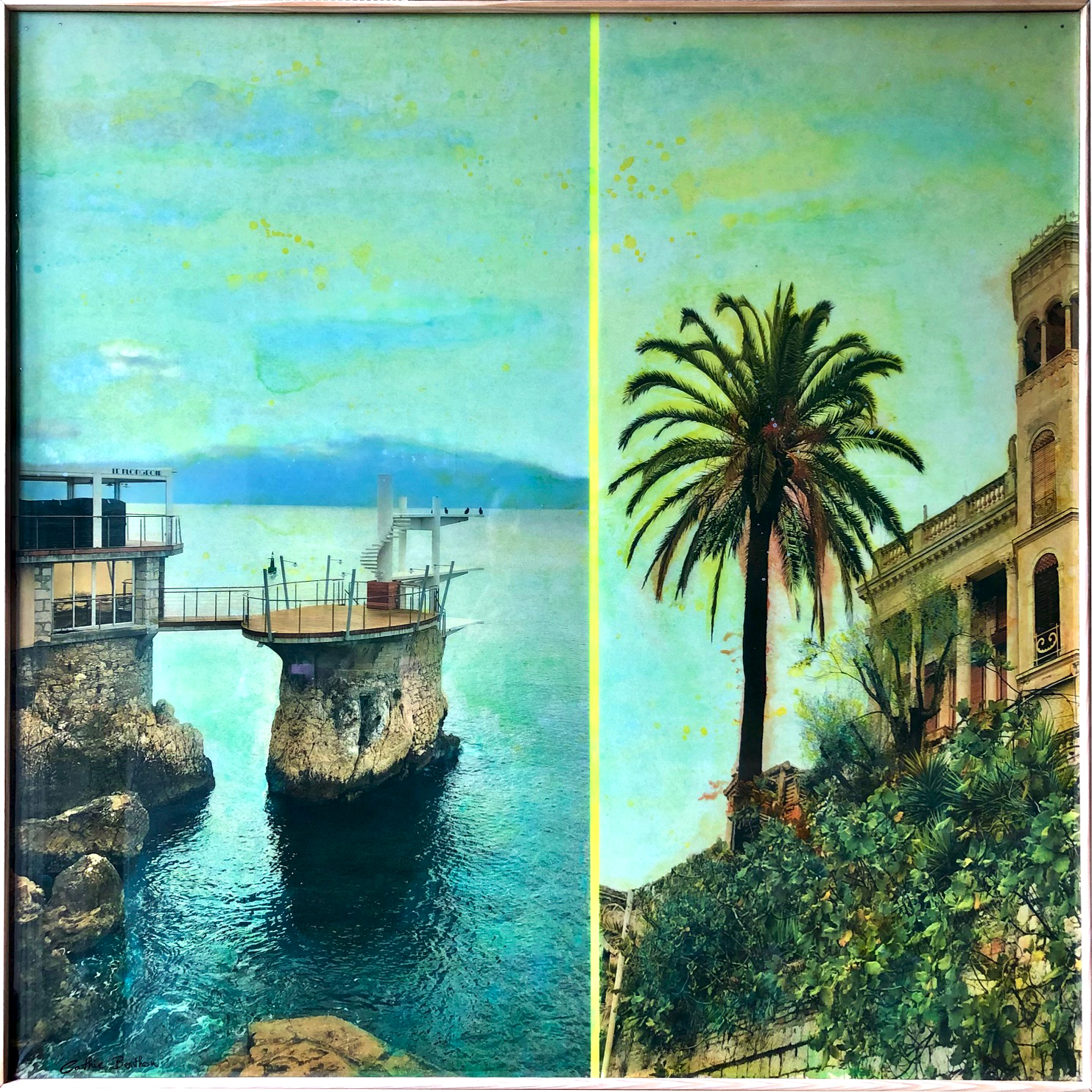 Je retravaille mes clichés de paysages glanés depuis des années au gré de voyages. Les paysages sont parfois réassemblés à partir de plusieurs points de vue. Désaturées puis imprimées sur bois, ces compositions photographiques sont ensuite recolorisées entièrement avec des encres. La gamme colorimétrique choisie donne un aspect vintage aux oeuvres, et une résine époxy magnifie les couleurs |