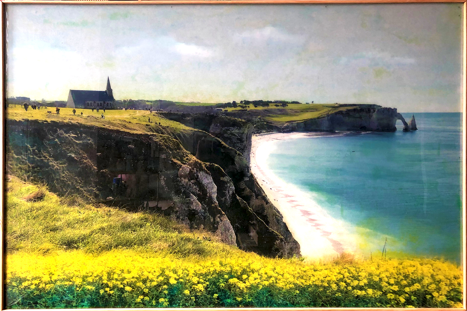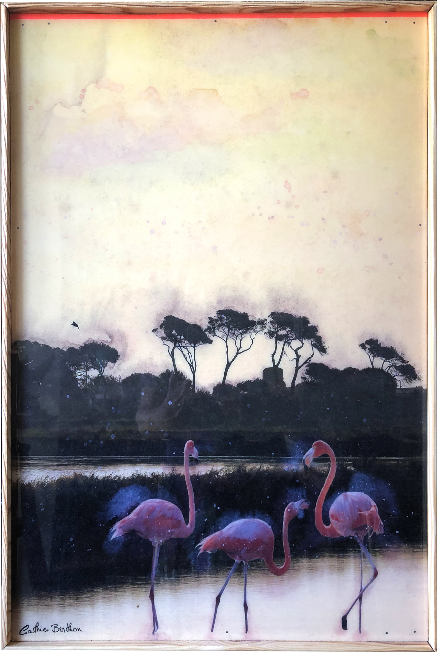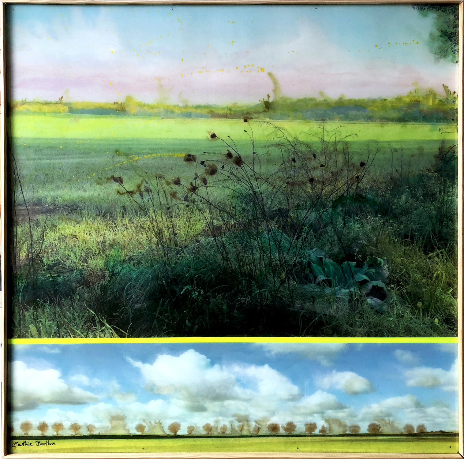 Je retravaille mes clichés de paysages glanés depuis des années au gré de voyages. Les paysages sont parfois réassemblés à partir de plusieurs points de vue. Désaturées puis imprimées sur bois, ces compositions photographiques sont ensuite recolorisées entièrement avec des encres. La gamme colorimétrique choisie donne un aspect vintage aux oeuvres, et une résine époxy magnifie les couleurs |